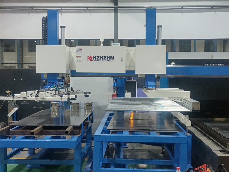 激光上下料機與儲料塔庫一起,實現料庫自動出料,激光上下料機自動上料,下料分料,廢料分離,成品料入庫;可加配板材厚度測量,雙層板材檢測等功能;